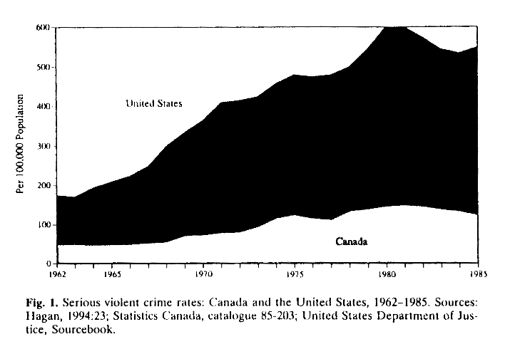 Figure 1, which depicts the serious violent crime rates for both countries from 1962 to 1985, illustrates vividly that, at the time of both national surveys, the levels of violent crime in Canada are well below those in the United States, and shows how the difference between the two countries has grown. According to Hagan (1994), incidence of the most serious types of crime in the United States was more than five times the rate for Canada in 1985. In that year, well over 500 such crimes per 100,000 population were committed in the United States, as compared with just over 100 in Canada. In addition, the incidence of the most serious crimes has been rising in the United States in recent years, while the rate has been falling in Canada. Between 1983 and 1985 the rate of serious violent crime rose 3 percent in the United States, but fell 10 percent in Canada.