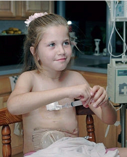 Jennifer Bush, 8, applies medicine from a syringe as treatment for a rare disease at her Coral Springs, Fla., home in this Jan. 25, 1996 photo. Jennifer has been hospitalized more than 200 times, undergone 40 operations and has accumulated $3 million in medical expenses. Jennifer has been placed under state care and her mother, Kathy Bush, jailed for allegedly causing her illnesses, known as Munchausen Syndrome by Proxy, a rare form of child abuse in which an adult intentionally makes a child ill in order to get attention.