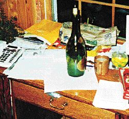 She noted that in a downstairs hallway there was a bottle of wine beside a telephone on a desk, and in a nearby wine glass there was an "oily substance."