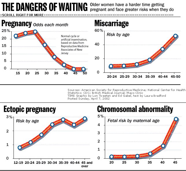 For most women Hewlett interviewed, childlessness was more like what one called a "creeping nonchoice." Time passes, work is relentless. The travel, the hours--relationships are hard to sustain. By the time a woman is married and settled enough in her career to think of starting a family, it is all too often too late. "They go to a doctor, take a blood test and are told the game is over before it even begins," says A.I.A.'s Madsen. "They are shocked, devastated and angry." Women generally know their fertility declines with age; they just don't realize how much and how fast. According to the Centers for Disease Control, once a woman celebrates her 42nd birthday, the chances of her having a baby using her own eggs, even with advanced medical help, are less than 10%. At age 40, half of her eggs are chromosomally abnormal; by 42, that figure is 90%. "I go through Kleenex in my office like it's going out of style," says reproductive endocrinologist Michael Slowey in Englewood, N.J.