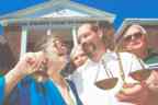 Lawyer Barbara C. Johnson (left) of Andover, Brian J. Meuse, and his parents -- Janice M. and Owen A. Meuse (background) of Haverhill -- celebrate his acquittal following a five-day trial in Haverhill District Court. The bell and scales of justice became symbols of Johnson's challenge to get Meuse a fair trial after their defense was rejected by Judge Allen G. Swan.