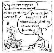 Whether they are single or married, have children or not, Australian men fall below comparable women on the happiness scale. And if they live alone, the average man is positively despondent.